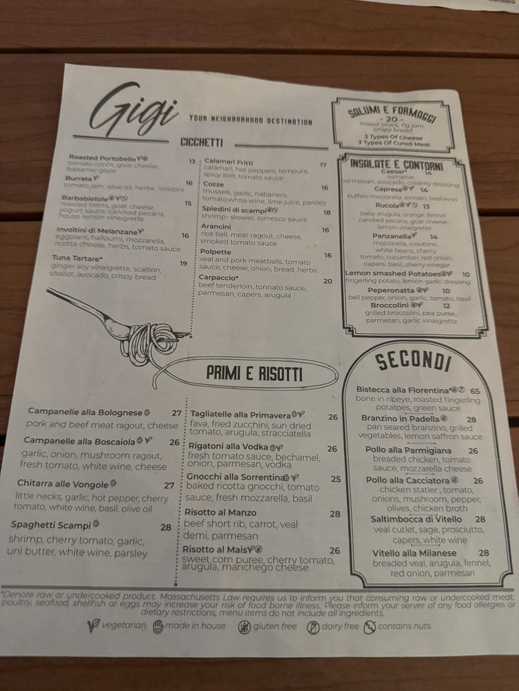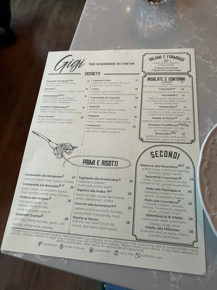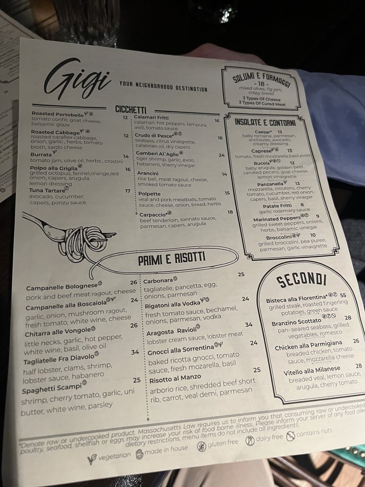 Introducing the menu at Gigi, a chic Italian cocktail bar located in Boston, MA. The menu features a variety of Italian dishes from Chicchetti to Insalata e Contorni to Primi E Risotti. Highlights include the flavorful Salumi E Formaggi, the creamy Burratta, and the hearty Campanelle Bolognese. Customer reviews rave about the great ambiance, personalized service, and delicious food. Gigi is praised for its intimate atmosphere, knowledgeable staff, and tasty cocktails. With a range of options for both meat lovers and vegetarians, Gigi is a must-visit for a romantic night out or a casual gathering with friends. Experience the best of Italian cuisine with a modern twist at Gigi.